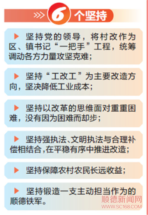一是堅持黨的領導,將村改作為區(qū)、鎮(zhèn)書記“一把手”工程,統(tǒng)籌調動各方力量攻堅克難。順德明確村改是區(qū)、鎮(zhèn)書記“一把手”工程,建立“一把手”負總責的機制,如果哪個鎮(zhèn)街推進不力,首先問責鎮(zhèn)街書記。同時,調動方方面面的資源和力量集中攻堅村改。在組織上,把村改主戰(zhàn)場作為培養(yǎng)、歷練、考察、使用干部的大舞臺,樹立起明確的用人導向;在宣傳上,報道頭版永遠留給村改工作、村改人;在執(zhí)法上,聚合全區(qū)所有執(zhí)法力量依法強執(zhí)法,等等。同時,堅持不設試點,十個鎮(zhèn)街十大軍團同時進發(fā),形成了你追我趕,相互競爭、相互學習的生動局面,營造出了村改勢不可擋的氛圍。