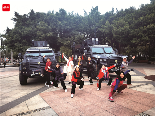 太極劍愛好者們在特警裝備車前合影留念。/珠江商報記者林安迪攝