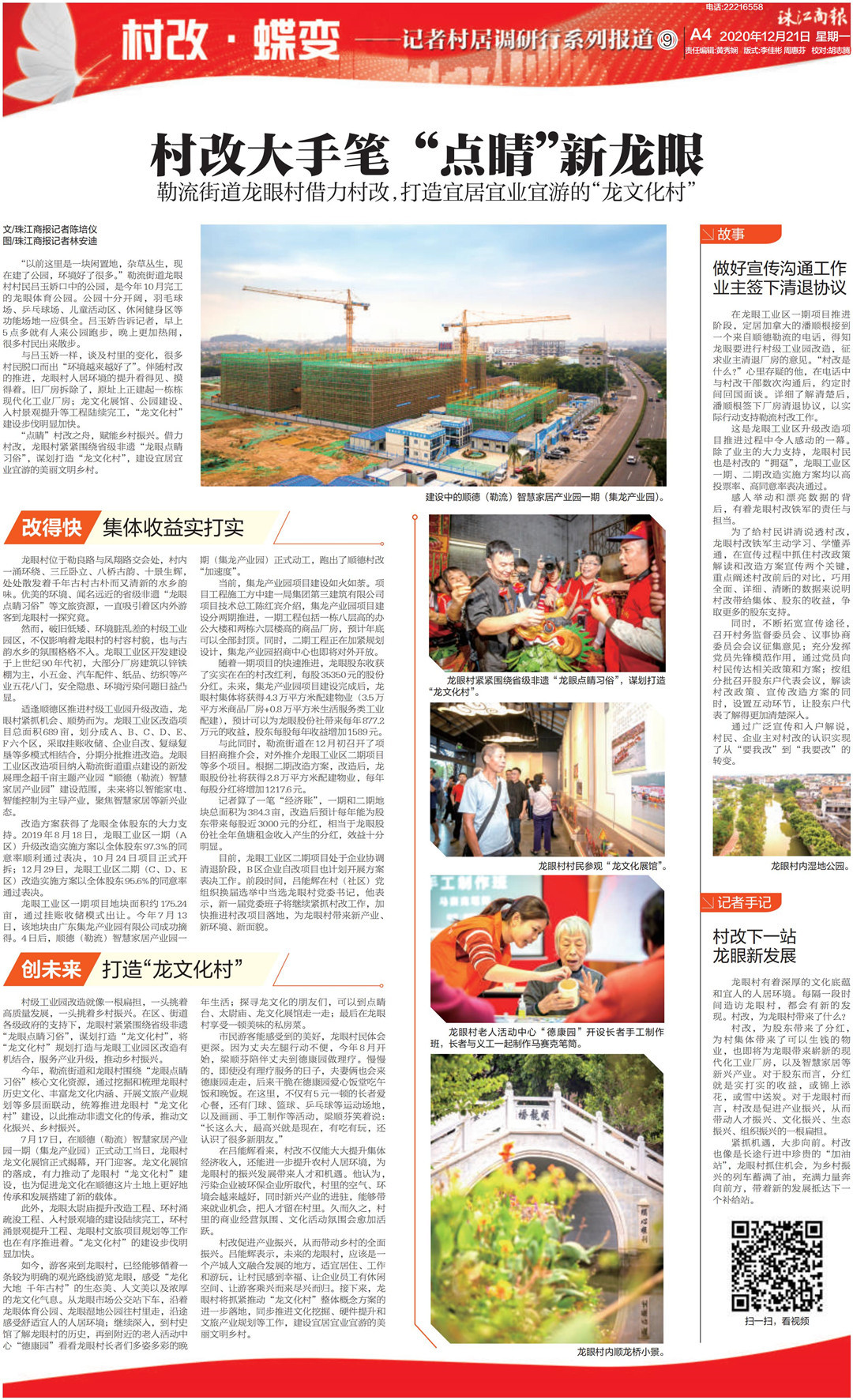 與呂玉嬌一樣,談及村里的變化,很多村民脫口而出“環(huán)境越來越好了”。伴隨村改的推進,龍眼村人居環(huán)境的提升看得見、摸得著。舊廠房拆除了,原址上正建起一棟棟現(xiàn)代化工業(yè)廠房;龍文化展館、公園建設、入村景觀提升等工程陸續(xù)完工,“龍文化村”建設步伐明顯加快。