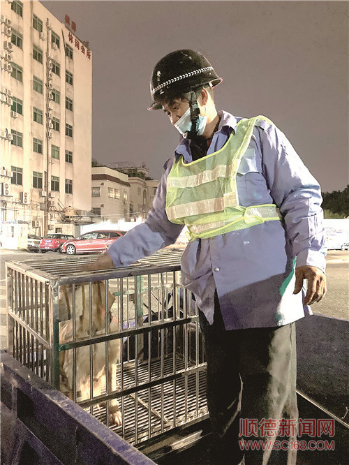 12 月16 日晚,順德區(qū)城市管理和綜合執(zhí)法局聯(lián)動十鎮(zhèn)街分局開展了區(qū)鎮(zhèn)兩級文明養(yǎng)犬執(zhí)法行動。圖為執(zhí)法人員安撫被抓捕的金毛。