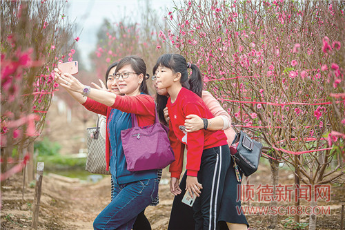 去年1 月11 日舉辦的第二屆勒流連杜桃花會(huì)暨桃花鄉(xiāng)宴品鑒活動(dòng)中,市民正在桃花林中自拍。