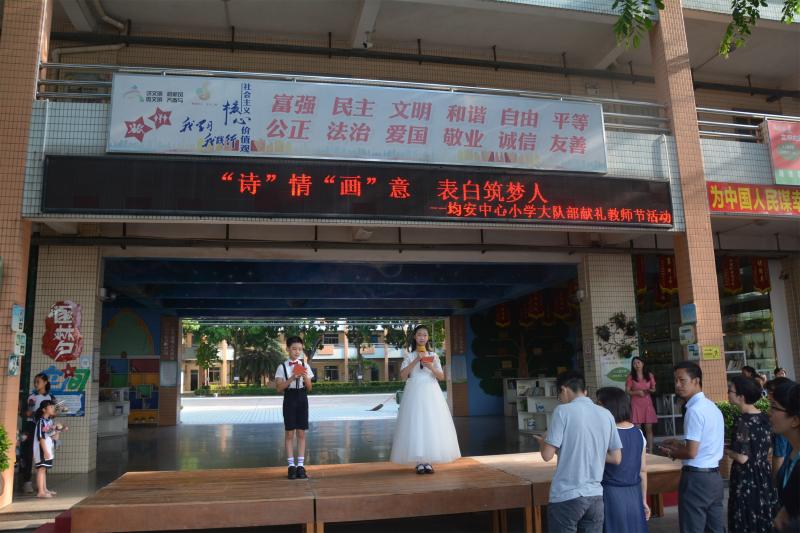 隨后,少先隊(duì)均安中心小學(xué)大隊(duì)邱雅詩(shī)同學(xué)特發(fā)出倡議,號(hào)召大家尊師敬師,聽(tīng)從老師的教誨,學(xué)做優(yōu)秀的少先隊(duì)員。