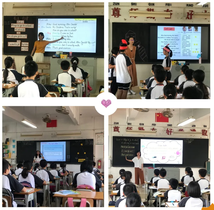90后的老師同課異構(gòu)的內(nèi)容是PEP人教版六年級上冊Unit 2 Ways to go to school A Let’s try & Let’s talk對話課,各個老師用流利的口語拉開帷幕,首先利用音樂導(dǎo)入課程,引導(dǎo)學(xué)生觀察圖片,猜測人物活動,引出難點單詞和重點句型。教學(xué)活動的設(shè)計豐富多彩,訓(xùn)練方式多樣,有全班活動、師生互動、小組活動、雙人活動、個人展示等,在活動中突破難點,在活動中發(fā)展能力。
