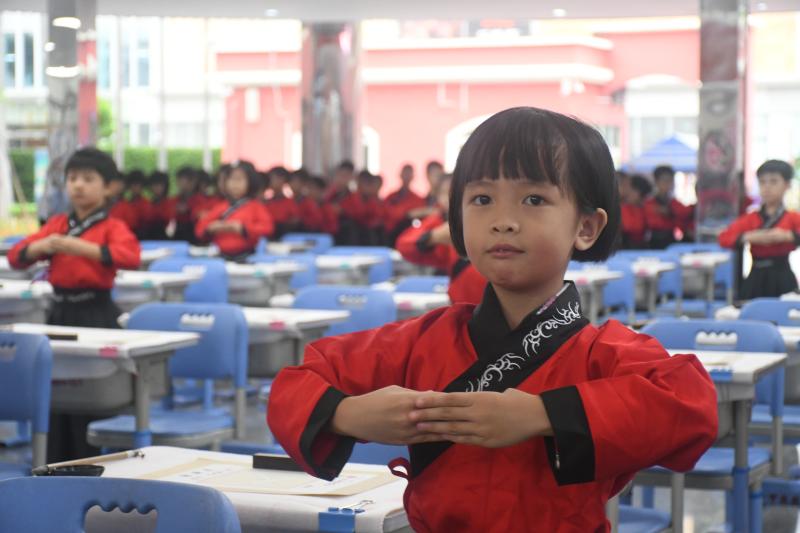 9月28日,一個莊嚴(yán)恢弘的主席臺搭建在大堂正中央,兩邊屏風(fēng)環(huán)繞,禮、儀、孝、悌、忠、信、廉、恥的條幅點綴其中。順德一中教育集團容桂實驗學(xué)校一年級新生“開筆禮”儀式,就這樣成功地搶占了學(xué)校頭條。穿戴整齊的漢服萌娃們,跟隨級長譚淑儀老師的引領(lǐng),跟隨班主任老師的腳步,踏著古詩韻律,合掌緩緩進入會場,拉開了活動的序幕。嘉賓席上,許勇輝先生校長、德育處李福古副主任等行政領(lǐng)導(dǎo)與一年級的家長朋友們,共同見證了這一神圣的時刻,現(xiàn)場響起一片經(jīng)久不息的贊嘆聲和掌聲。
