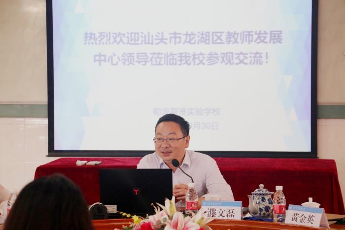 參觀完校園后,在二樓會議室開展座談會,會議由吳海堅副主任主持。會上,濮文磊校長對汕頭市龍湖區(qū)教師發(fā)展中心領導專家一行的來訪表示熱烈的歡迎。與會人員一同觀看了學校宣傳片,使他們對學校文化建設有更深的了解。濮文磊校長對學校的發(fā)展歷程、辦學理念、辦學特色以及學校一體化發(fā)展作了簡要的匯報。