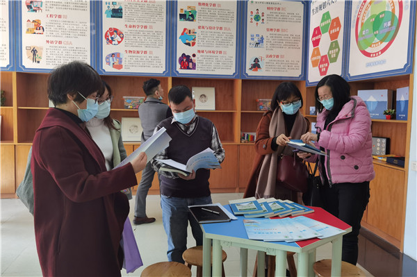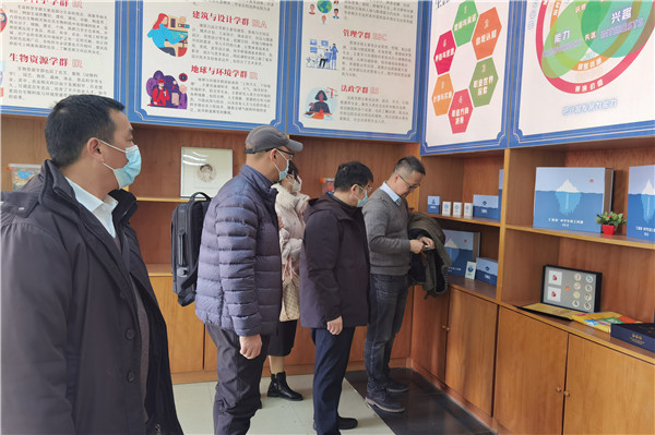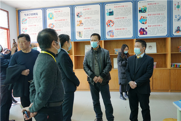 嘉賓們隨后前往科學館心理室參觀。心理室共有四層樓。一樓是教師辦公室和生涯活動室,我校自2012年始開展學生生涯發(fā)展教育,多年來結(jié)合學?!俺腥A夏傳統(tǒng),納四海文明”的辦學理念和揚長教育的辦學特色,提出了“自主探索、體驗引導”的生涯發(fā)展教育育人理念,通過打造專業(yè)師資,開發(fā)校本課程、學科滲透、主題實踐活動和建立生涯檔案等多種途徑探索生涯教育發(fā)展之路。嘉賓們在生涯活動室中參觀了學生的生涯主題版畫作品,研究了上課使用的材料和卡牌,與我校心理老師就生涯教育的開展進行了探討。