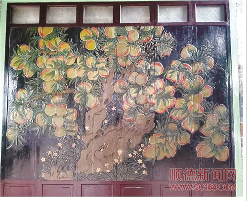 《百壽桃》位于清暉園博物館內(nèi)一座外表平實(shí)、低調(diào)的磚木結(jié)構(gòu)單間廳堂“小蓬萊”內(nèi),為大型木浮雕。上刻一棵枝繁葉茂、果實(shí)飽滿的仙桃樹,碩大的“仙桃”透出熟透的紅暈,襯出滿堂喜氣。雖說是《百壽桃》,但粗略數(shù)來卻只有99個(gè)桃子,這是為什么呢?