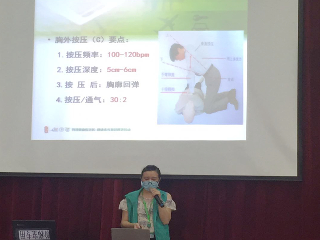 本次知識講座分為理論知識講解和實際操作兩部分,張醫(yī)生采用PPT形式,從心跳呼吸驟??砂l(fā)生的場所、個體、心肺復蘇概念、黃金救命時間等方面做了詳細的介紹,同時結合不同傷情下應采取的不同急救措施,對心肺復蘇各環(huán)節(jié)技術和流程進行了現場示范。