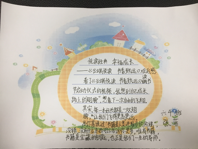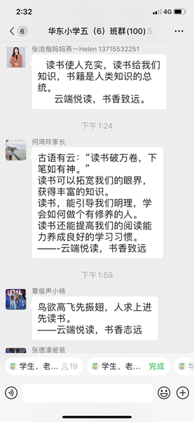 恰逢今天是五、六年級(jí)學(xué)生返校,于是本次活動(dòng)分線下和線上釘釘直播兩部分進(jìn)行。首先,由龍家怡老師向五、六年級(jí)全體師生介紹本次活動(dòng)的意義和介紹讀書節(jié)啟動(dòng)儀式活動(dòng)流程。其次,由葉麗燕副校長詳細(xì)解讀本學(xué)期讀書節(jié)活動(dòng)方案。然后,學(xué)生們觀看讀書節(jié)啟動(dòng)儀式視頻并撰寫觀后感。一到四年級(jí)的讀書節(jié)啟動(dòng)儀式在釘釘班群上也同時(shí)進(jìn)行。班主任通過直播向?qū)W生、家長介紹了本次云端讀書節(jié)活動(dòng),對(duì)學(xué)生的閱讀方法進(jìn)行指導(dǎo)后,觀看讀書節(jié)啟動(dòng)儀式視頻。視頻中,龍江鎮(zhèn)教育局教研專干陳金梅、龍江鎮(zhèn)教育局德育專干和專職責(zé)任督學(xué)劉自力、李耀宗校長、各行政干部、骨干教師代表、家長和學(xué)生代表通過引用關(guān)于“讀書”的名人名言,號(hào)召全體師生多讀書,讀好書,積極參與到讀書節(jié)的各項(xiàng)活動(dòng)中去。在看完了讀書節(jié)啟動(dòng)儀式視頻后,同學(xué)和家長紛紛表示:視頻拍得太好了,讓人深深陶醉在書香中。六(4)班彭誠真同學(xué)在觀后感里面寫到:書籍,可以滋養(yǎng)我們的靈魂。讓我們與書相伴,幸福成長。二(6)班劉雅婷家長說:為華東小學(xué)的讀書節(jié)點(diǎn)贊!讓讀書成為一種時(shí)尚,讓學(xué)習(xí)成為一種習(xí)慣。讀萬卷書,行萬里路!