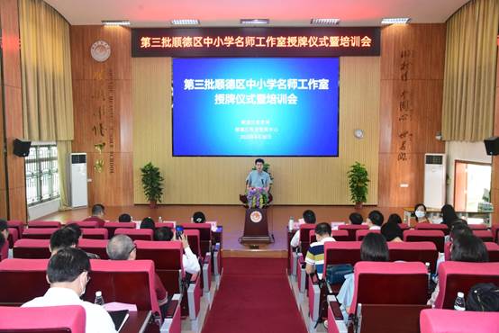 2020年6月30日,第三批順德區(qū)中小學(xué)名師工作室授牌儀式暨培訓(xùn)會在順德區(qū)華僑中學(xué)實驗室一樓階梯室隆重舉行。廣東省中小學(xué)教師培訓(xùn)專家工作室主持人、肇慶學(xué)院副院長肖起清教授,區(qū)教育局冼彌冬副局長,區(qū)教育局組織人事科劉進(jìn)華科長、曾麗輝副科長,區(qū)教育發(fā)展中心何儀昌副書記,區(qū)教育發(fā)展中心教師發(fā)展研究室唐信焱主任、吳海堅副主任,區(qū)教育局、區(qū)教育發(fā)展中心相關(guān)領(lǐng)導(dǎo)和老師,以及我區(qū)第三批名師工作室首席主持人、項目主持人近140人參加了本次會議。會議由劉進(jìn)華科長主持。