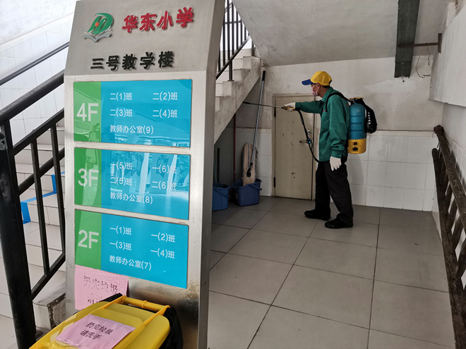 此外,學校還組織后勤人員每天進行晨掃、下午掃和消毒,加大校內(nèi)清掃力度,認真落實清掃保潔制度,及時清掃辦公樓道、廁所,及時清理垃圾污物,保證環(huán)境衛(wèi)生整潔。還組織保安員不定期噴灑消毒液,防止“四害”傳媒疾病的發(fā)生和流行,確保師生身體健康。