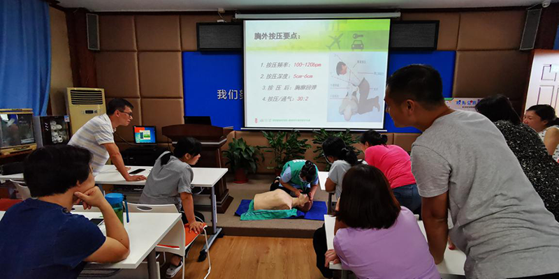 此次培訓分為兩部分:第一部分為《從壓力中營救自己》心理健康講座,由譚好欣醫(yī)生給師生上了一節(jié)心理健康教育課,教會我們?nèi)绾蚊鎸ぷ鳌W習和生活中來自不同的各種壓力;如何釋放各種各樣的壓力;最后如何把壓力轉(zhuǎn)變?yōu)槌晒Φ膭恿?。第二部分為學習心肺復蘇知識培訓,教會老師們在生活中遇到突發(fā)狀況進行人工徒手心肺復蘇等內(nèi)容,結(jié)合實際救護技巧進行詳細講解,并現(xiàn)場進行操作展示,學員們對此表現(xiàn)出強烈的求知欲,在醫(yī)生的指導下紛紛參與實操演練,力求掌握胸外心臟按壓這一急救方法和注意事項。