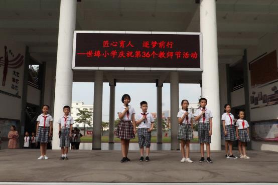 最后,全校教師一起走上階臺(tái),接受少先隊(duì)員代表們的獻(xiàn)花。少先隊(duì)員代表們手捧一支支鮮花走上臺(tái)來,恭敬地將手中的花朵送給我們敬愛的老師,借此表達(dá)他們對(duì)老師最崇高的敬意??粗瑢W(xué)們送來的一朵朵鮮花,老師們都露出了感動(dòng)的笑容,向同學(xué)們表達(dá)了真誠(chéng)的謝意以及內(nèi)心的喜悅。