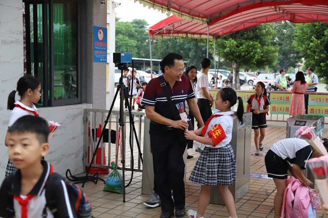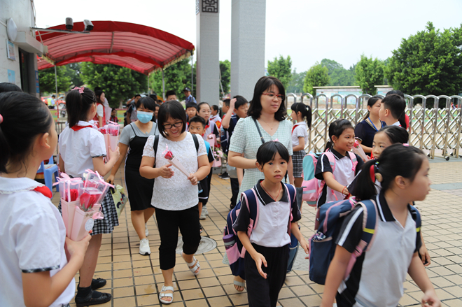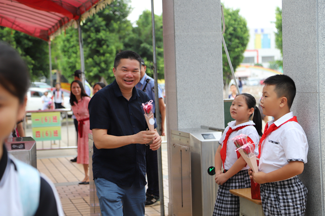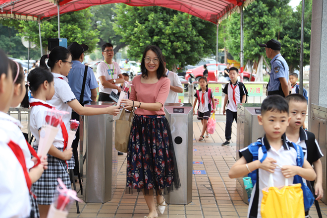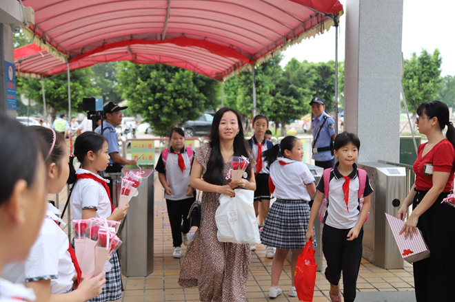 9月10日早上,少先隊隊員代表們手捧鮮花列隊為教師們送花。一朵鮮花,一個微笑,一份感恩,就這樣在華東小學校門口傳遞著。