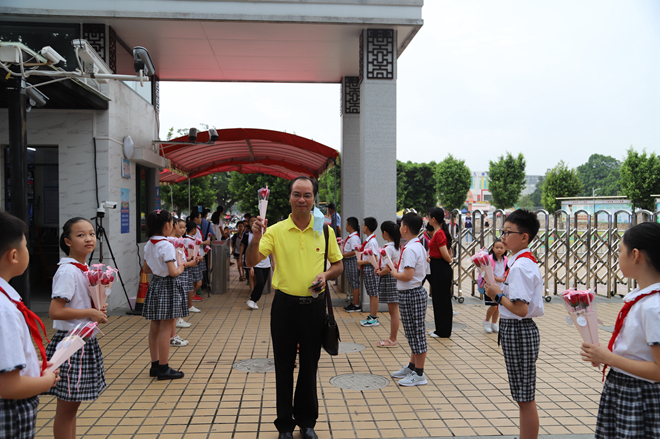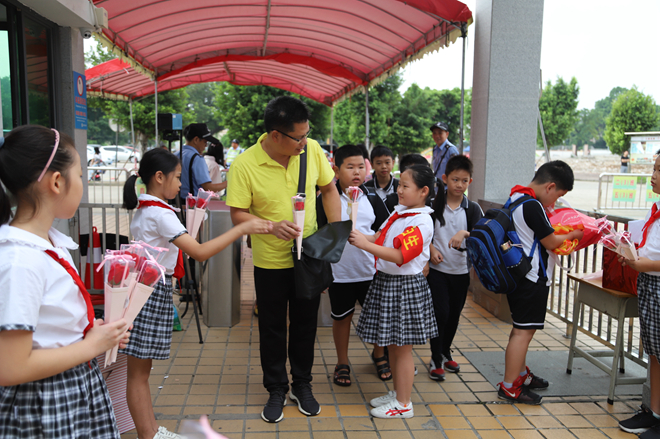 9月10日早上,少先隊(duì)隊(duì)員代表們手捧鮮花列隊(duì)為教師們送花。一朵鮮花,一個(gè)微笑,一份感恩,就這樣在華東小學(xué)校門口傳遞著。