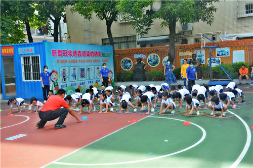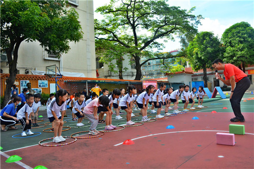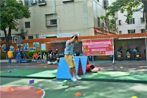 活動第三站,學(xué)校劉志明老師帶領(lǐng)幼兒園小朋友們上了一節(jié)趣味盎然的體育課。帶領(lǐng)小朋友們做好充分地?zé)嵘頊?zhǔn)備后,劉老師根據(jù)龜兔賽跑的課程主題,學(xué)習(xí)了烏龜與兔子賽跑的姿勢,融入了對應(yīng)角色,進(jìn)行賽跑活動教學(xué)。幼兒園小朋友們各展所能,竭盡全力地奔赴終點。