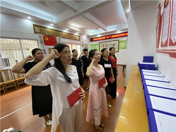 7月1日由黨支部書記柯英麗向在座的黨員們送去節(jié)日的祝福和問候,并介紹了此次活動(dòng)開展的目的和意義。幾位黨員圍繞“如何發(fā)揮先鋒作用”談?wù)勛陨砀形?,找找自身存在的問題和原因,在思想上經(jīng)受一次“洗禮”。隨后,慶祝黨員何秀華、姚麗嫦、吳裕蘭、柯英麗四位同志“政治生日”,在莊嚴(yán)的氣氛中黨支部書記帶領(lǐng)黨員舉起右手,面對黨旗,重溫入黨誓詞。