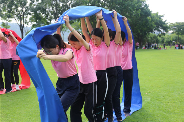 本次拓展活動,在主持人高嘉韻老師的帶領(lǐng)下,通過投身到熱身游戲、團隊協(xié)作、挑戰(zhàn)自我的分組競賽,感悟自我潛能和團隊力量,達到溝通融洽人際關(guān)系,突破自我、提升團隊意識的目的。全體教職員工分成四個小組分別參加了“穿衣服接龍”、“超級無敵風火輪”、“齊心火車”等訓練項目。在各組隊長的組織下,各隊員分工合理,配合到位,在規(guī)定時間內(nèi)有條不紊地順利完成每一個拓展游戲。游戲中,雖然大家遇到了各種問題和困難,但是通過隊員們的群策群力、默契配合和堅持不懈,最后都戰(zhàn)勝困難取得勝利。大家彼此忘記了年齡,忘記了身份,忘記了生活的環(huán)境,個個熱情高漲,全身心地投入到充滿有趣的拓展訓練中,體現(xiàn)了每個團隊戰(zhàn)勝困難、爭取勝利的信心和決心,盡情地展現(xiàn)團隊的凝聚力、戰(zhàn)斗力和創(chuàng)造力。