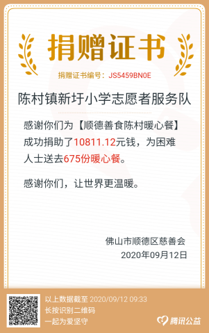 “99公益日”活動(dòng)時(shí)間為每年9月7日-9月9日,在這三天時(shí)間里,新圩小學(xué)家長志愿者服務(wù)隊(duì)積極響應(yīng)陳村慈善會(huì)暖心餐項(xiàng)目,在“99公益日平臺(tái)”的捐助倡議,致力為陳村鎮(zhèn)困難長者、殘疾人解決買菜難、煮飯難的問題、帶去生活便利、減輕經(jīng)濟(jì)負(fù)擔(dān)。