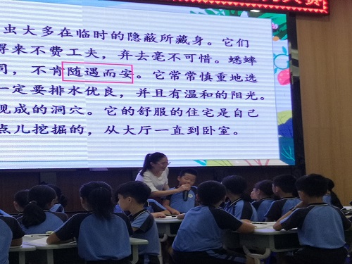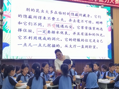 下午的第二場課堂展示環(huán)節(jié),張小語老師給在場評委和老師們帶來了有趣生動的《蟋蟀的住宅》一課。張老師先從其他動物的家入手,引出蟋蟀的住宅;緊接著帶領(lǐng)學(xué)生從具體語句領(lǐng)略蟋蟀住宅的外部特點、內(nèi)部設(shè)置等特點,感受蟋蟀住宅是一項偉大的工程。最難能可貴的是,張老師引導(dǎo)學(xué)生品析句子,并能針對性的給予指導(dǎo),反復(fù)朗讀,細(xì)細(xì)品味,讓學(xué)生在關(guān)鍵詞的誦讀中體會蟋蟀住宅的偉大。在老師的啟發(fā)引導(dǎo)下,學(xué)生主動探究,大膽質(zhì)疑,積極思考。