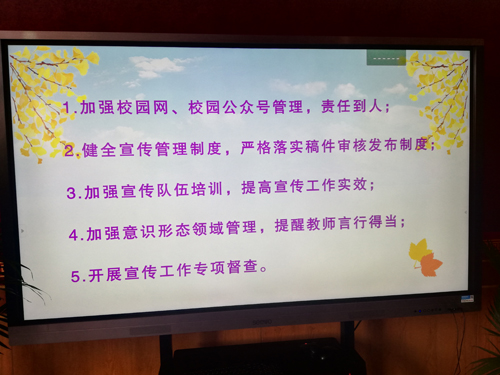 本次會(huì)議由永豐小學(xué)教導(dǎo)處陳坤玲副主任主持,她在會(huì)議中向我們傳達(dá)倫教街道宣傳會(huì)議的5個(gè)重點(diǎn):1、加強(qiáng)校園網(wǎng)、校園公眾號(hào)管理,責(zé)任到人;2、健全宣傳管理制度,嚴(yán)格落實(shí)稿件審核發(fā)布制度;3、加強(qiáng)宣傳隊(duì)伍培訓(xùn),提高宣傳工作實(shí)效;4、加強(qiáng)意識(shí)形態(tài)領(lǐng)域管理,提高教師言行得當(dāng);5、開(kāi)展宣傳工作專(zhuān)項(xiàng)督查。