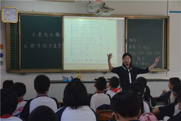 首先,評估專家“推門”深入課堂聽課,隨機聽取了語文、數(shù)學、音樂等課堂教學,深入了解教師教學和學生課堂學習的開展情況。語文課上,梁健欣老師結合學?!皩W導練”互助教學模式展示小組互助學習,充分發(fā)揮學生的學習主體性,創(chuàng)設以生為主的互助課堂;數(shù)學課上,張綺雯老師創(chuàng)設精彩的足球比賽情境,放手讓學生以小組為單位進行探究、討論、展示,充分展示了“學導練”互助教學課堂;音樂課上,肖曉虹老師引導學生圍繞“彩虹”的特點,通過猜謎語、七色光的描述、伴唱、二聲部的演唱等環(huán)節(jié),與學生們共同演唱了“七色光之歌”,滲透積極向上的陽光教育,體現(xiàn)了奮揚學校“讓每一個生命都沐浴陽光”的辦學理念。教師的循循善誘,活躍的課堂氣氛、學生們自信而大方的表現(xiàn),給評估組專家留下了深刻的印象。
