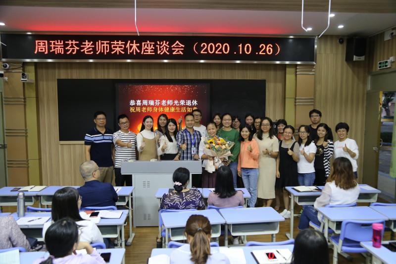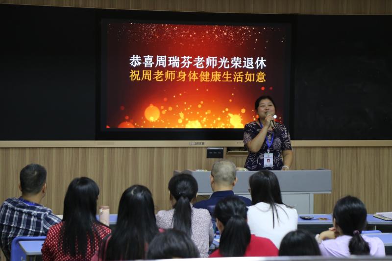 大屏幕前,幻燈片和著音樂(lè),翻開(kāi)了周老師的華美篇章,展現(xiàn)了她光輝的教育歷程。傅文芳校長(zhǎng)發(fā)表了熱情洋溢的講話,周老師用樸實(shí)嚴(yán)謹(jǐn)?shù)娘L(fēng)格,教育了一屆又一屆學(xué)生;她用宅心仁厚的品格,影響了一批又一批教師。她兢兢業(yè)業(yè),無(wú)私奉獻(xiàn),把最美好的芳華都獻(xiàn)給了教育事業(yè)。她是我們敬重的前輩,是我們學(xué)習(xí)的榜樣!”隨后周老師深情回顧了自己工作的經(jīng)歷,并感謝學(xué)校召開(kāi)如此隆重的榮休座談會(huì)。