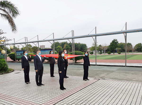空曠的操場(chǎng)上,莊重如常。張永新校長(zhǎng)和行政團(tuán)隊(duì)分別擔(dān)任本次儀式的升旗手和護(hù)旗手,步伐整齊劃一。