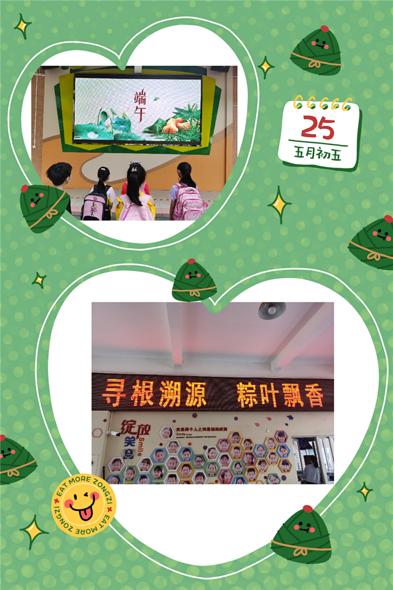 校園內(nèi),大隊(duì)部利用升旗儀式和LED大屏幕宣傳欄,積極營造濃厚的宣傳氛圍,追溯端午淵源,宣傳端午節(jié)的文化與習(xí)俗,讓學(xué)生充分了解“端午節(jié)”的有關(guān)知識。