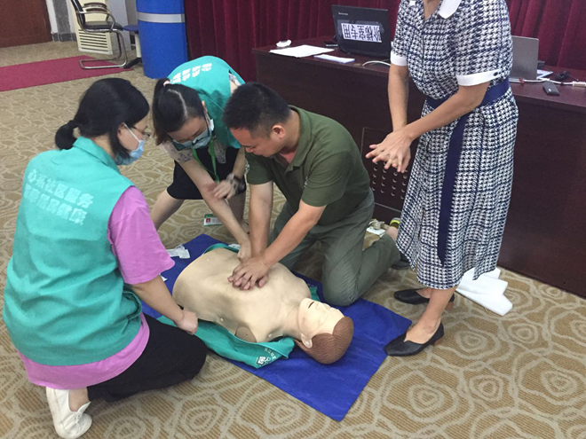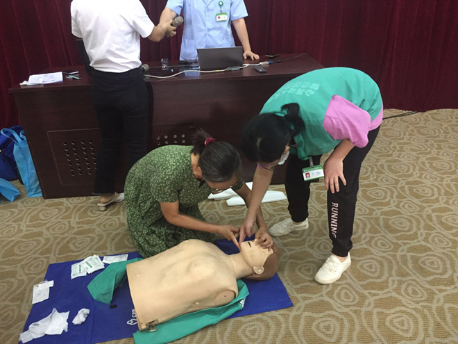 本次知識講座分為理論知識講解和實際操作兩部分,張醫(yī)生采用PPT形式,從心跳呼吸驟??砂l(fā)生的場所、個體、心肺復(fù)蘇概念、黃金救命時間等方面做了詳細(xì)的介紹,同時結(jié)合不同傷情下應(yīng)采取的不同急救措施,對心肺復(fù)蘇各環(huán)節(jié)技術(shù)和流程進行了現(xiàn)場示范。