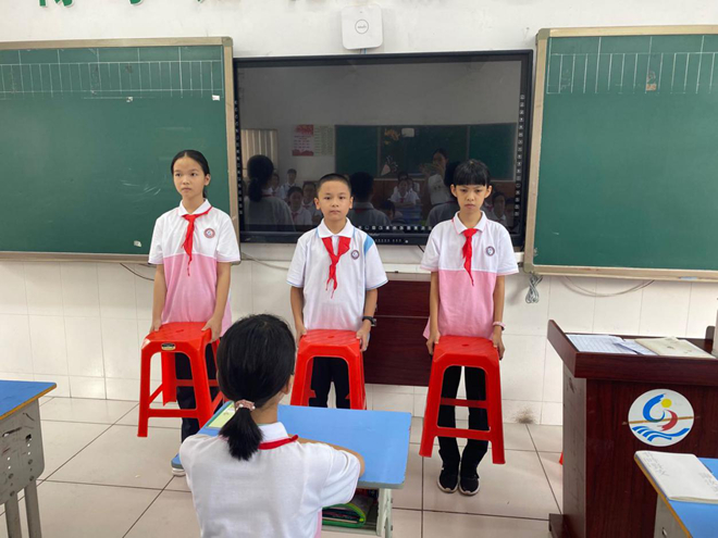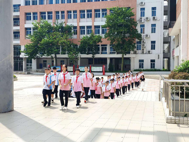 (初二的班長(zhǎng)帶領(lǐng)各班“傳經(jīng)送寶”,參觀校園)