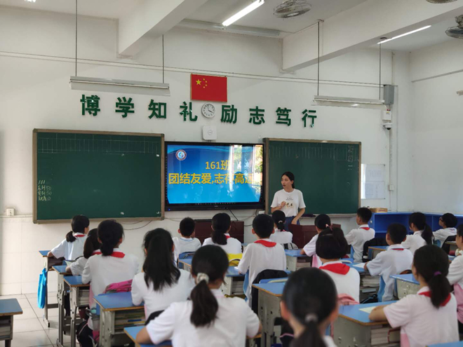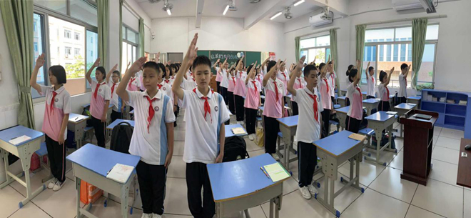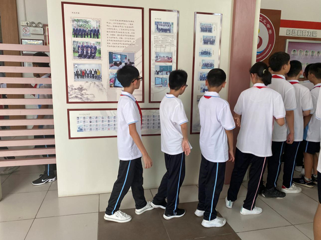 班會(huì)結(jié)束后,我們還進(jìn)行了一個(gè)非常有意義的活動(dòng),就是“傳經(jīng)送寶”――初二師哥師姐帶我們參觀校園,師哥師姐個(gè)個(gè)能言會(huì)道,向我們生動(dòng)地介紹了校園的“名勝”打卡:校訓(xùn)廣場(chǎng)、禁毒長(zhǎng)廊、心理咨詢室和運(yùn)動(dòng)場(chǎng)等。