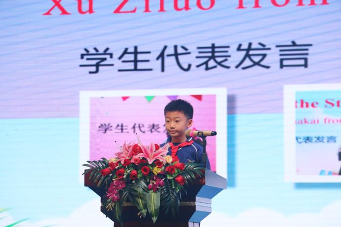 表演結(jié)束后,三年(8)班徐梓洛同學(xué)作為英語特色班代表發(fā)言。他用流利的英語跟大家分享了在本次英語嘉年華中的收獲以及學(xué)習(xí)英語的心得體會,表達(dá)了對英語的喜愛之情,感謝學(xué)校提供的英語特色課程讓他的英語學(xué)習(xí)之路變得多姿多彩。同時他希望自己能夠帶著一口流利的英語環(huán)游世界與世界各地的人交朋友,向他們介紹我們國家,開啟在英語世界的多彩夢想。