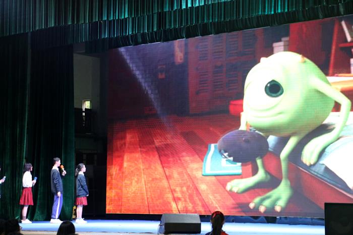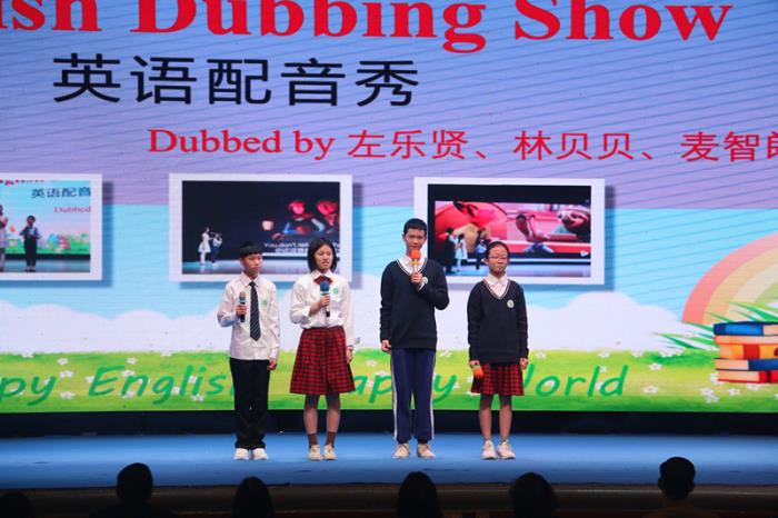 最后,初中英語特色班左樂賢、林貝貝、麥智朗、葉欣桐四位同學(xué)為動畫電影《冰雪奇緣》、《怪獸公司》配音,該節(jié)目配妙趣橫生,配音演員們在臺上仿佛與角色融為了一體。他們用自己的聲音和語言在舞臺上精彩還原了電影中的人物性格特色,一人分飾兩角,將電影中角色的聲音模仿的活靈活現(xiàn)。嫻熟的英語發(fā)音、抑揚(yáng)頓挫的情感節(jié)奏,讓場下的觀眾們?nèi)缗R其境,掌聲不斷。