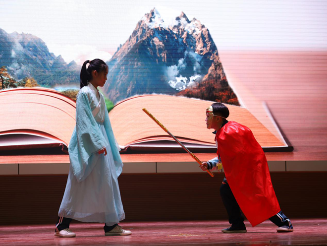 這次活動,各班的代表同學(xué)集合大家的智慧,寫劇本、制作道具、配音,以小劇場的形式在舞臺上為全年級師生表演了《西游記》中的經(jīng)典故事,如158班的《豬八戒撞天婚》、159班的《二調(diào)芭蕉扇》、160班的《車遲國斗法》、161班的《三打白骨精》等,小演員們的表演十分精彩有趣,動作表情滑稽又不失活力。活動的現(xiàn)場精彩紛呈,贏得了師生們一陣又一陣熱烈的掌聲。極大地激發(fā)同學(xué)們閱讀名著的興趣。