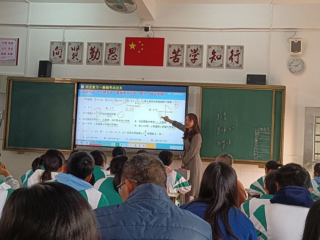 課堂上周偉萍老師從基礎(chǔ)考點(diǎn)過(guò)關(guān)開始,從??贾R(shí)點(diǎn)與學(xué)生循循善誘,語(yǔ)言親切,讓學(xué)生如沐春風(fēng),學(xué)生如在和風(fēng)暖陽(yáng)中收獲知識(shí)。之后用思維導(dǎo)圖進(jìn)行歸納。而后通過(guò)重難點(diǎn)突破中的用希沃白板的函數(shù)技術(shù)對(duì)反比例函數(shù)幾何性質(zhì)進(jìn)行動(dòng)態(tài)演示,最后點(diǎn)亮廣東省中考?jí)狠S題的反比例函數(shù)的思維火花,使數(shù)學(xué)課堂與信息技術(shù)高度相融合。陽(yáng)山老師聽完課后不經(jīng)意間脫口而出的“厲害”道出所有老師的聽課心聲。