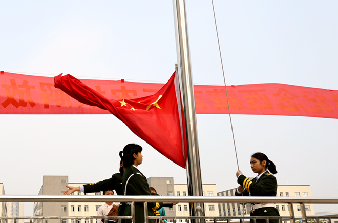 升旗儀式上,全體師生奏唱國歌,行莊嚴(yán)的注目禮。