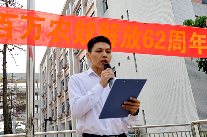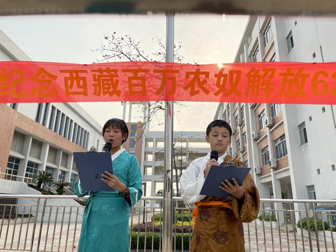 西藏部鄭林莊主任在國旗下講話中指出:“我們今天在這里開展‘3.28’慶祝活動,是為了紀(jì)念62年前的今天西藏百萬農(nóng)奴得解放,62年來,在黨中央的特殊關(guān)懷和無數(shù)革命先輩的奮斗下,西藏取得了翻天覆地的偉大變化,我們各民族要像石榴籽一樣,緊緊團(tuán)結(jié)在一起。希望我們同學(xué)知史鑒今,珍惜當(dāng)下,努力學(xué)習(xí),為建設(shè)美麗西藏、美麗中國貢獻(xiàn)自己的力量?!?/span>