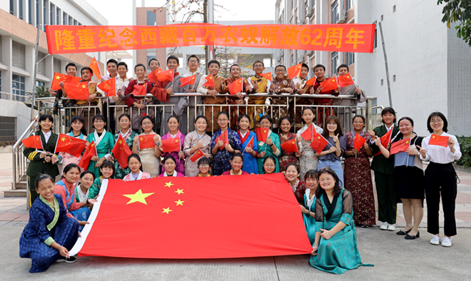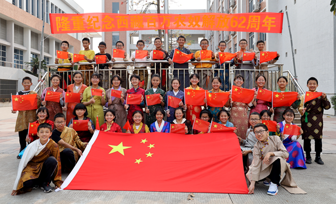 3月28日,江義中學(xué)內(nèi)地班全體同學(xué)身著傳統(tǒng)藏式服裝,齊聚國旗下,熱烈慶?!?.28”西藏百萬農(nóng)奴解放62周年,全體內(nèi)地班師生參加此次升旗儀式。