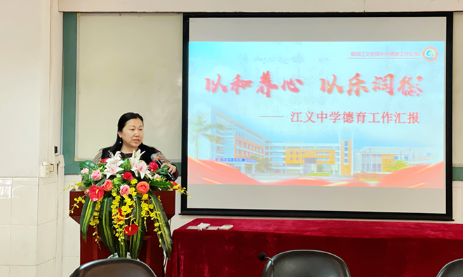 在匯報(bào)工作中,江義中學(xué)周霞副校長作了題為“以和養(yǎng)心,以樂潤德”的德育工作匯報(bào)。她從管理機(jī)制、心育工作、德育課程和創(chuàng)新工作這四個方面進(jìn)行匯報(bào)。