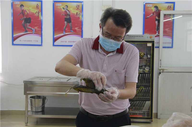 隨后,空課的老師們陸續(xù)到達學(xué)校飯?zhí)瞄_始包粽子。有經(jīng)驗的老師將糯米、豬肉等材料在粽葉中填滿扎牢;沒有包粽子經(jīng)驗的老師,在同事的幫助下,現(xiàn)場邊看邊學(xué),踐行操作,直至熟練掌握包粽技巧。