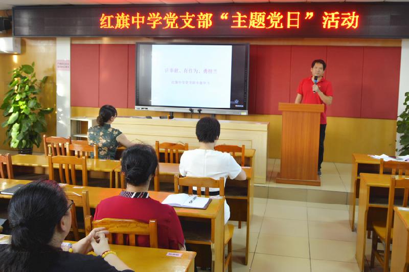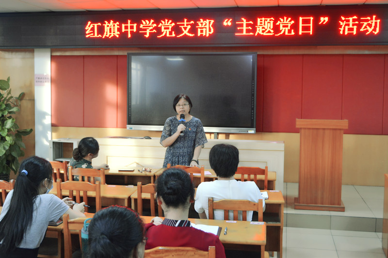 活動在雄壯的國歌聲中拉開了序幕。隨后,紅旗中學(xué)黨支部書記陳亞玲同志帶領(lǐng)支部全體黨員重溫入黨誓詞,感悟黨的使命,進(jìn)一步強化初心和責(zé)任擔(dān)當(dāng)。首先表彰了2020年上半年在教育教學(xué)、創(chuàng)先爭優(yōu)、防疫抗疫工作中表現(xiàn)突出的黨員干部,并進(jìn)行了現(xiàn)場頒獎。