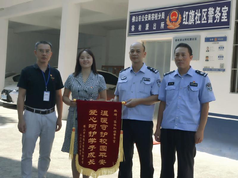 2020年7月14日下午,容桂紅旗中學黨委書記、校長陳亞玲攜行政班子一行專門來到容桂紅旗警務室,送上印有“愛心呵護學子成長 溫暖守護校園平安”的錦旗,對紅旗警務室日夜為學校的安全穩(wěn)定工作給予的幫助和指導表示感謝。