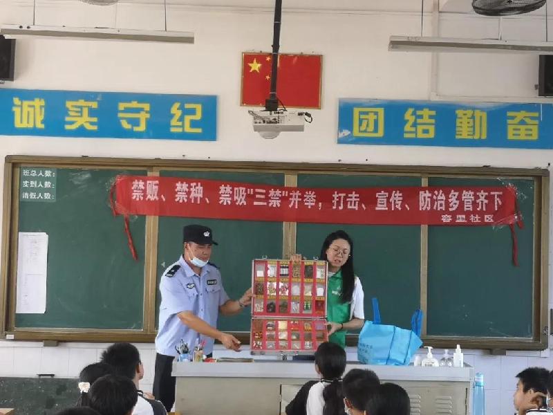 容桂派出所新地社區(qū)民警中隊(duì)郭德雄警長的帶領(lǐng)下,容桂派出所綜合室和容桂派出所刑警隊(duì)?wèi)?yīng)邀來到我校六年級,為六年級的學(xué)生開展了主題為“反詐先鋒 有我無騙”和“禁販、禁種、禁吸‘三禁’并舉,打擊、宣傳、防治多管齊下”的教育,郭警長親自做主持,現(xiàn)場給學(xué)生講述了被詐騙的案例,并告訴學(xué)生如何與不法分子斗智斗勇;另外給刑警隊(duì)成員給學(xué)生展示了毒品模型,讓學(xué)生認(rèn)識到毒品的危害,感受到不法分子的隱晦。學(xué)生在警員們聲情并茂的合力教育下,增強(qiáng)了自身的法律意識,用法律武裝起來的學(xué)生們將更有智慧!而容里小學(xué)的安全教育也將警鐘長鳴!