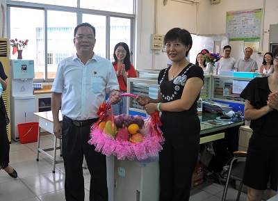接著,容桂街道黨工委、辦事處領(lǐng)導(dǎo)一行來到了辦公室向老師們進(jìn)行慰問,劉書記感謝老師們在疫情期間付出的努力,他贊揚(yáng)老師們疫情期間堅守崗位,關(guān)注學(xué)生身心健康,時刻留意著學(xué)生情況,并積極與家長做好溝通工作。最后,劉書記代表政府向老師們送上最誠摯的節(jié)日祝福和慰問果籃,老師們紛紛對慰問領(lǐng)導(dǎo)一行表達(dá)了感謝。