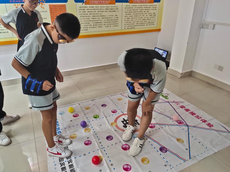 VR體驗區(qū)和游戲互動區(qū)內(nèi),同學(xué)們在社工們的幫助下戴上VR眼鏡、負重袋等設(shè)備,在模擬情境中體驗吸食毒品帶來的不良反應(yīng)。參與者時而害怕,時而慌亂,聲聲驚嘆中對吸食毒品有了一個較為清醒的認識。