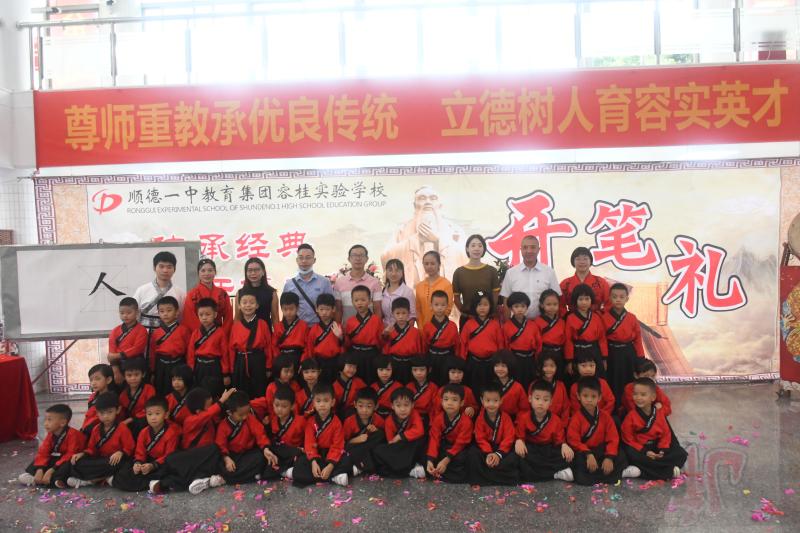 9月28日,一個莊嚴(yán)恢弘的主席臺搭建在大堂正中央,兩邊屏風(fēng)環(huán)繞,禮、儀、孝、悌、忠、信、廉、恥的條幅點綴其中。順德一中教育集團(tuán)容桂實驗學(xué)校一年級新生“開筆禮”儀式,就這樣成功地?fù)屨剂藢W(xué)校頭條。穿戴整齊的漢服萌娃們,跟隨級長譚淑儀老師的引領(lǐng),跟隨班主任老師的腳步,踏著古詩韻律,合掌緩緩進(jìn)入會場,拉開了活動的序幕。嘉賓席上,許勇輝先生校長、德育處李福古副主任等行政領(lǐng)導(dǎo)與一年級的家長朋友們,共同見證了這一神圣的時刻,現(xiàn)場響起一片經(jīng)久不息的贊嘆聲和掌聲。