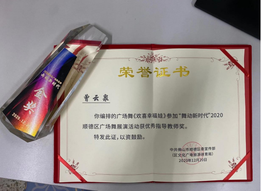 12月20日晚,“舞動(dòng)新時(shí)代”2020順德區(qū)廣場(chǎng)舞展演在順?lè)迳焦珗@舉行。容桂幸福陳占梅小學(xué)代表隊(duì)的《歡喜幸福娃》斬獲本次大賽金獎(jiǎng)、曾云泉老師榮獲優(yōu)秀指導(dǎo)教師獎(jiǎng)。