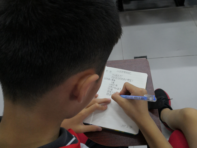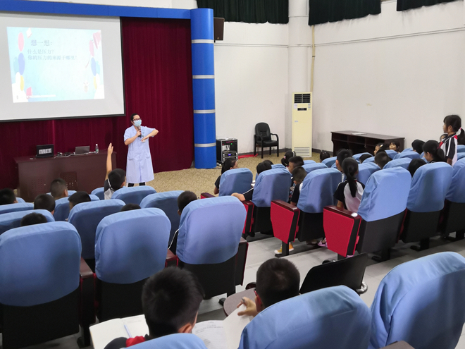 活動中,譚醫(yī)生從“壓力與身心健康”和“如何從壓力中營救自己”兩方面給孩子們上了一節(jié)輕松愉快的心理健康課。孩子們積極參與并發(fā)表了自己的見解,也將譚醫(yī)生給出的建議認真做好筆記。
