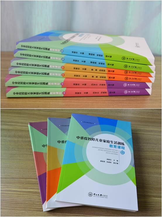 在堅持課程改革,探索特殊教育專業(yè)發(fā)展的道路上,梁敏儀特級教師工作室自2016年起,在王志超教授的專業(yè)指引下,完成了人性化課程系列教材的編寫,分為社會化、體能、情緒分化、言語、劃畫、圖形操作共17本教材,生活育人教材1本。這些教材的編寫意圖就是對學生課上、課下、生活進行統(tǒng)整的課程化的設(shè)計,讓學生能夠在學校生活中獲得全程的學習與成長體驗。2019年9月,課程教材交付出版社。2020年,由特級教師梁敏儀擔任主編,工作室成員蔡青、譚曉燕、馮學立、馬海萍、張威林、伍思婷分別擔任副主編的《中重度智障兒童家庭生活訓練教育課程(低、中、高)》教材由中山大學出版社正式出版。